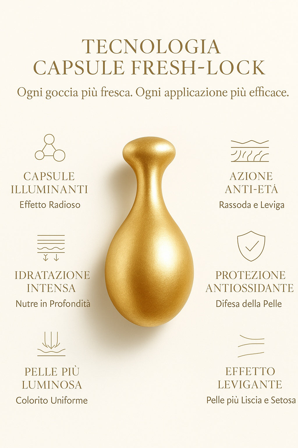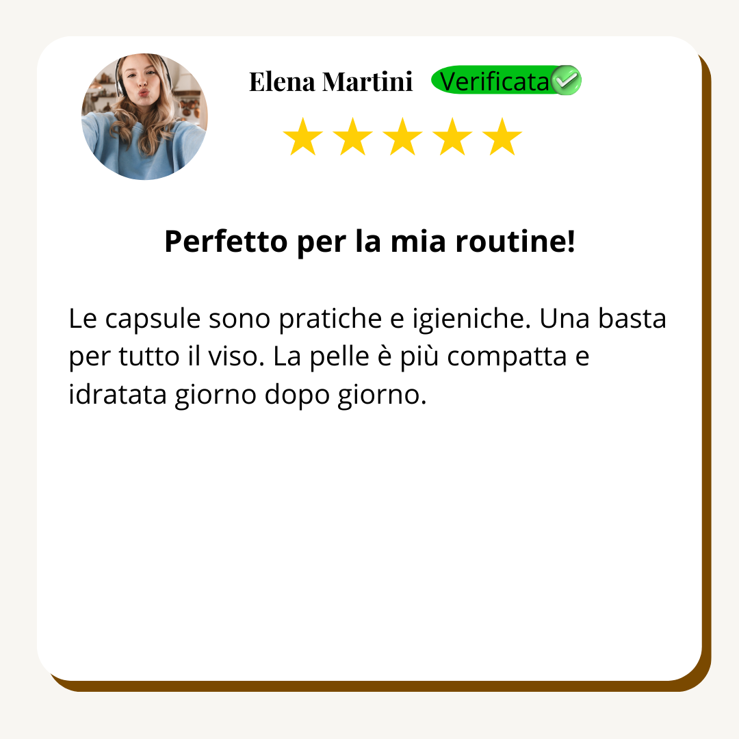 Ogni capsula racchiude un blend potente di attivi selezionati, progettati per agire in sinergia e offrire risultati concreti: la pelle appare subito più morbida, levigata e radiosa, mentre nel tempo migliora visibilmente in tono, elasticità e texture.