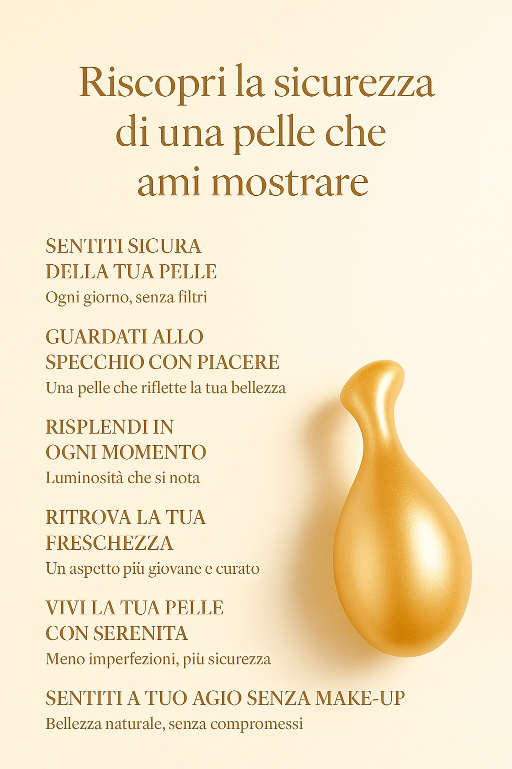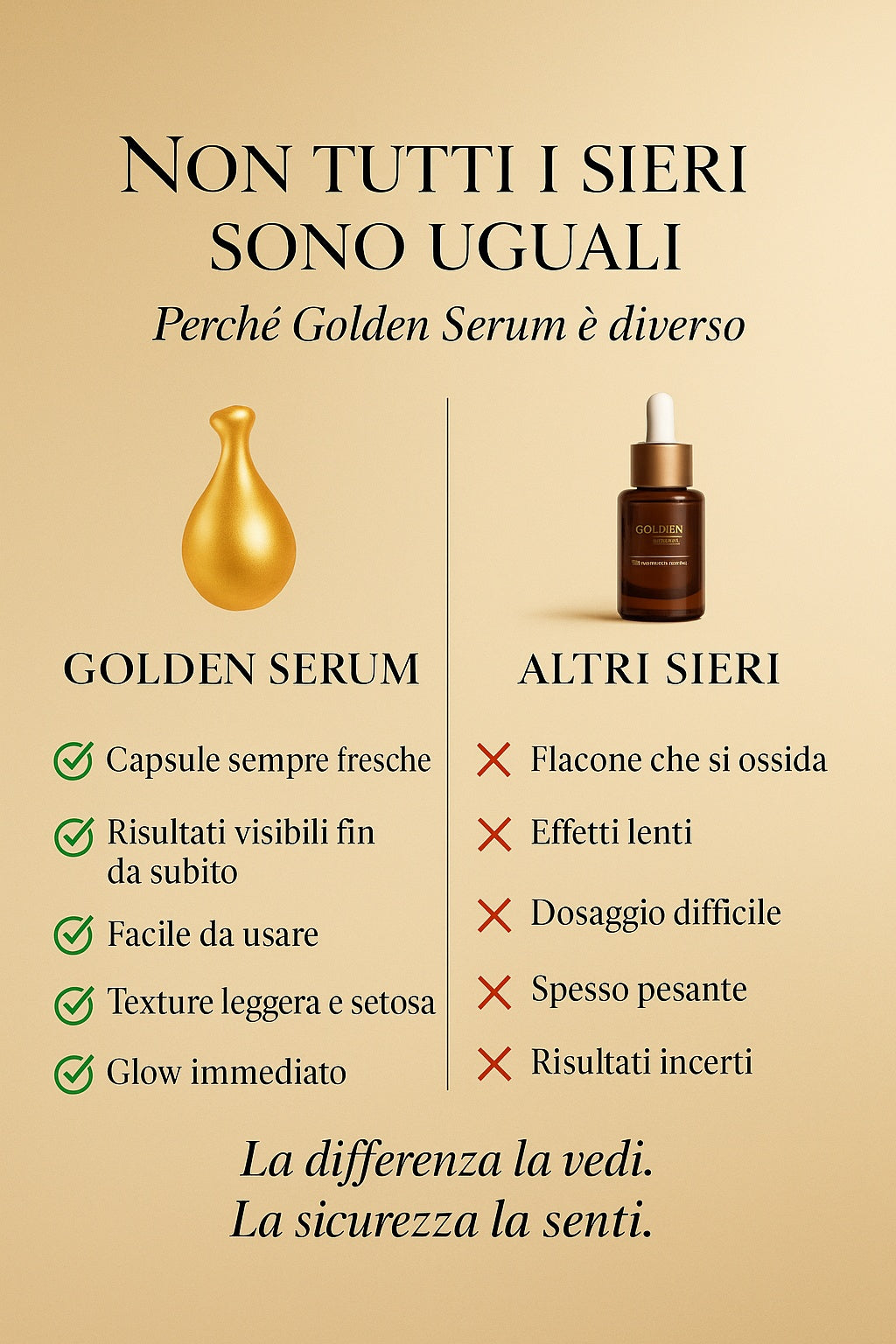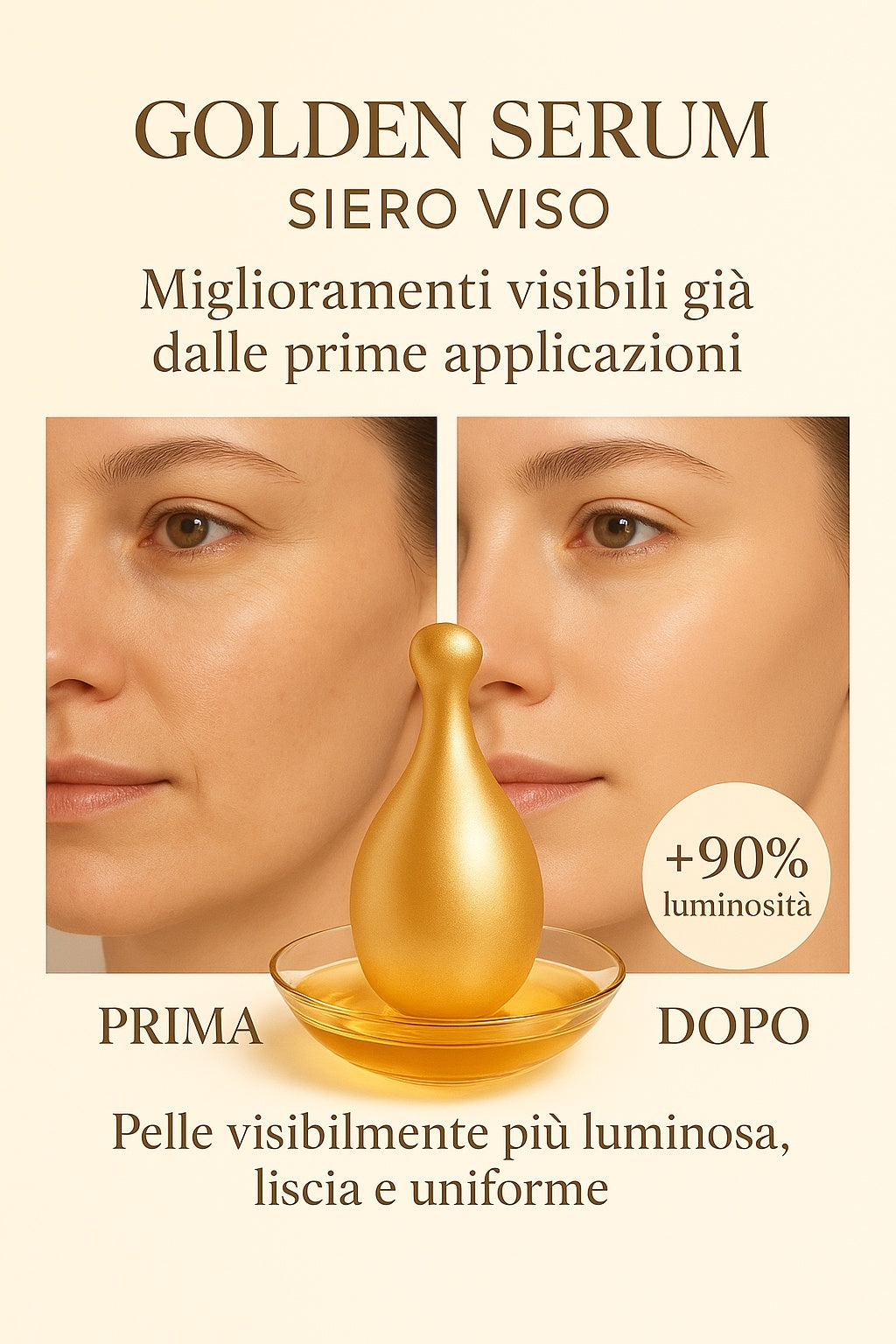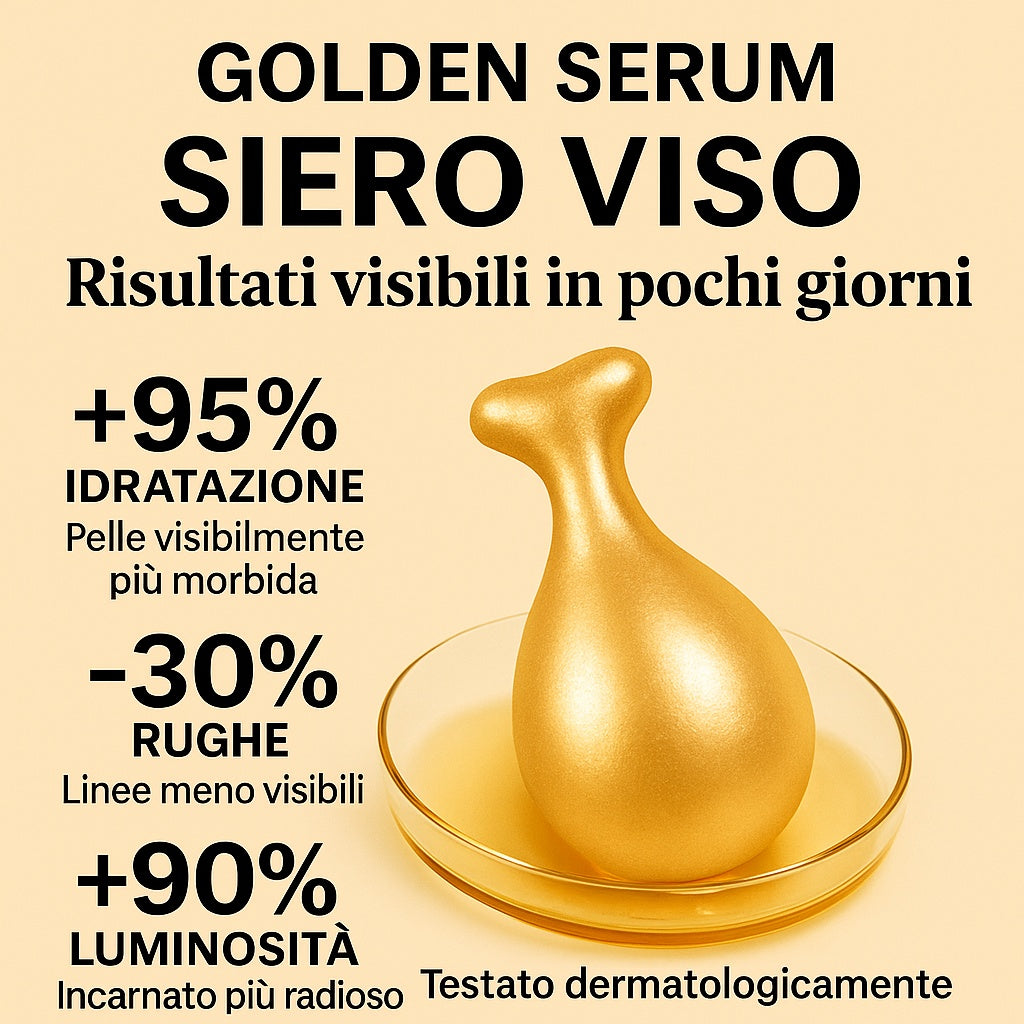 Golden Serum è un trattamento viso in capsule monodose ad alta concentrazione, formulato per migliorare visibilmente luminosità, compattezza e uniformità della pelle fin dalle prime applicazioni.